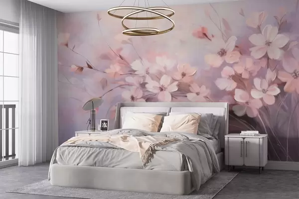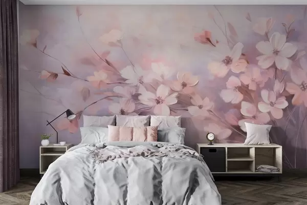 Wall Mural Photo Wallpaper A floral arrangement with delicate flowers with soft, blurred edges, against a pastel background of lavender and light pink hues Nr. w09369
