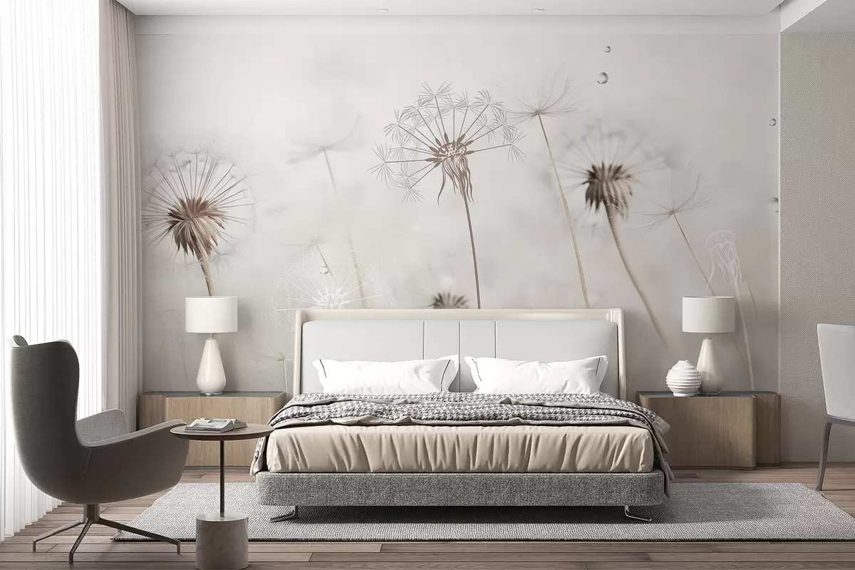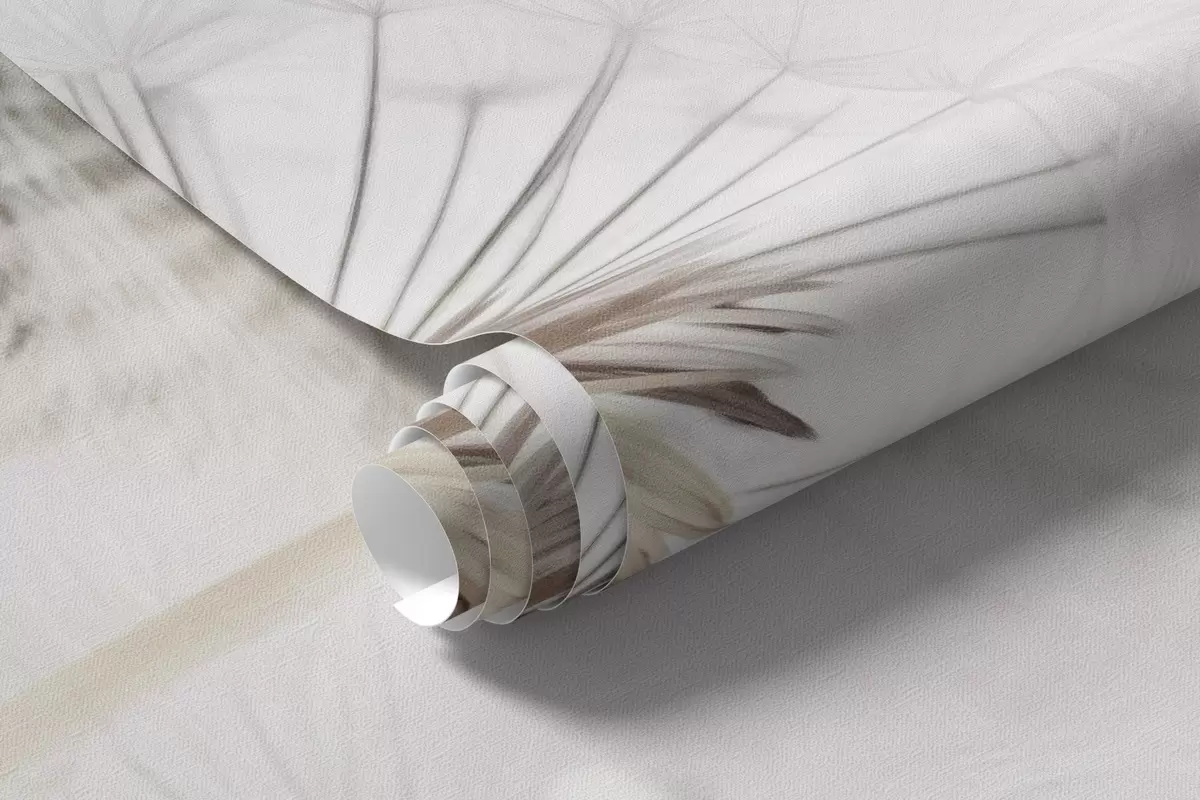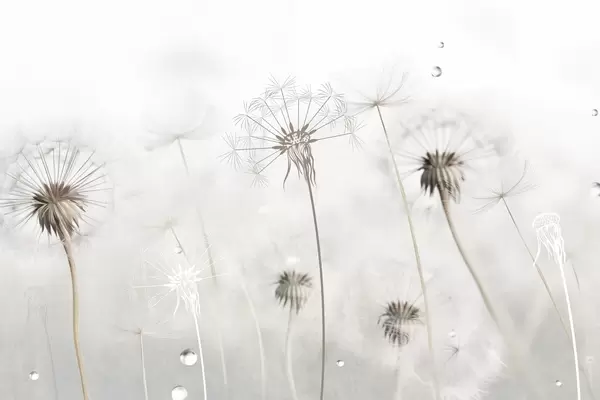 Wall Mural Photo Wallpaper Dandelions with water drops, white background, close up, soft light, nature, botanical, ethereal, delicate, minimalist Nr. w09399