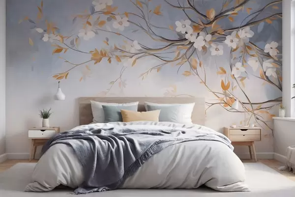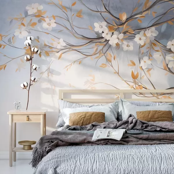Wall Mural Photo Wallpaper White flowers with orange leaves on a tree branch, light blue textured background, delicate brushstrokes Nr. w09415