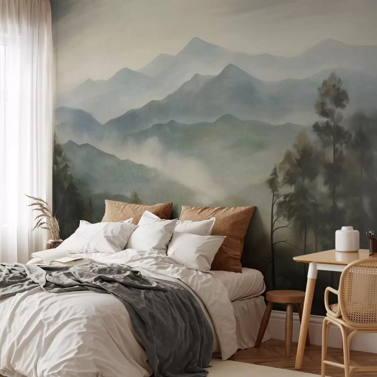 Wall Mural Photo Wallpaper Misty mountain range with trees, fog, cloudy sky, muted colors, landscape painting style Nr. w09424