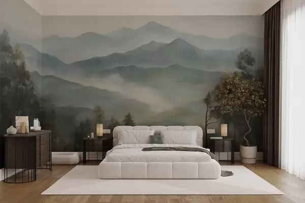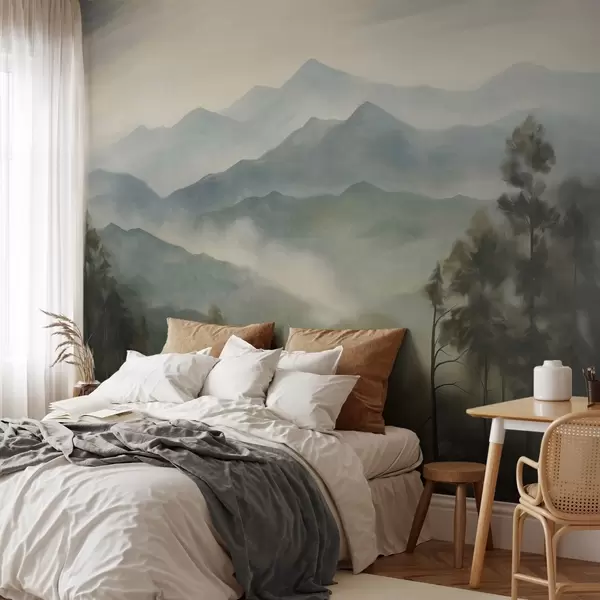 Wall Mural Photo Wallpaper Misty mountain range with trees, fog, cloudy sky, muted colors, landscape painting style w09424