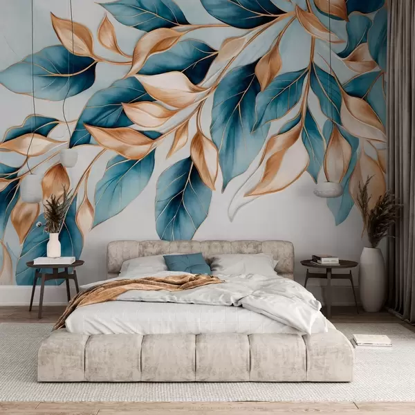 Wall Mural Photo Wallpaper Textured blue and orange leaves, light blue background, elegant and artistic manner design, modern style Nr. w09429