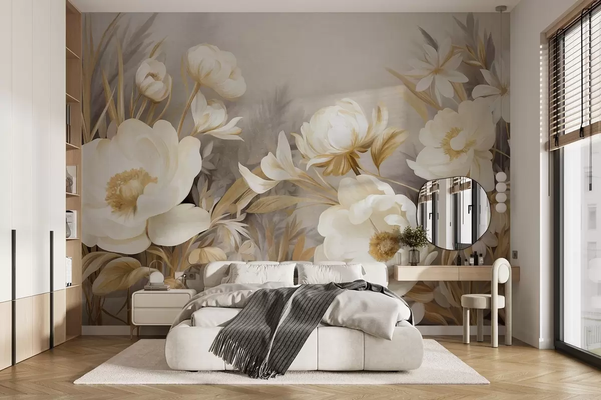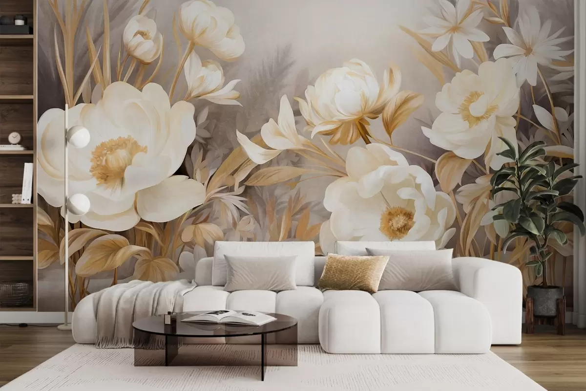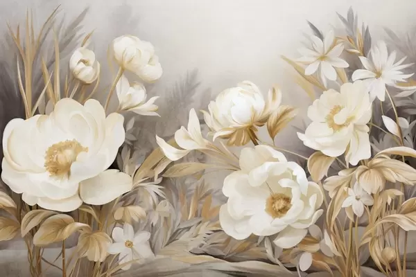 Wall Mural Photo Wallpaper White and yellow peonies and other flowers with tall grass and leaves in a soft, painterly textured style Nr. w09494
