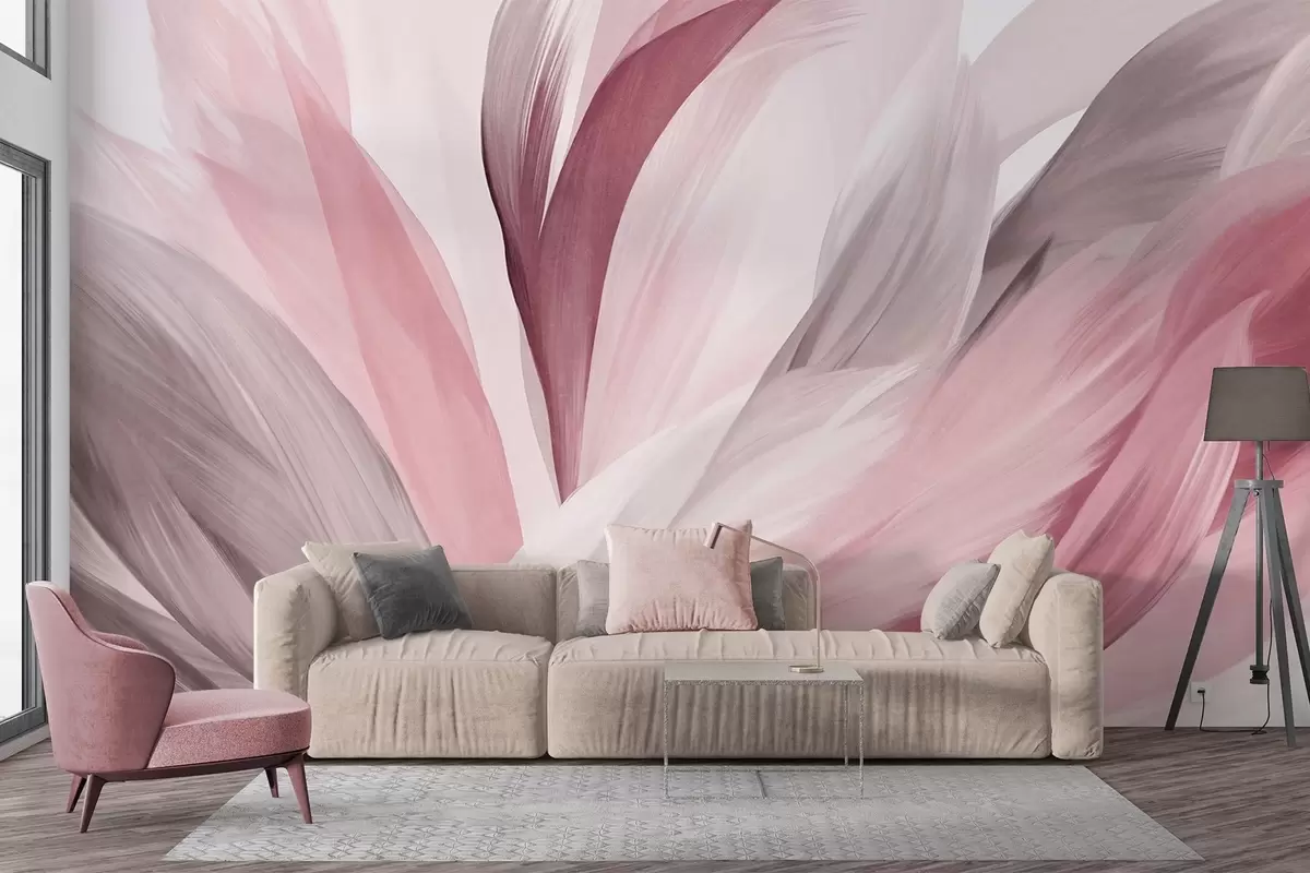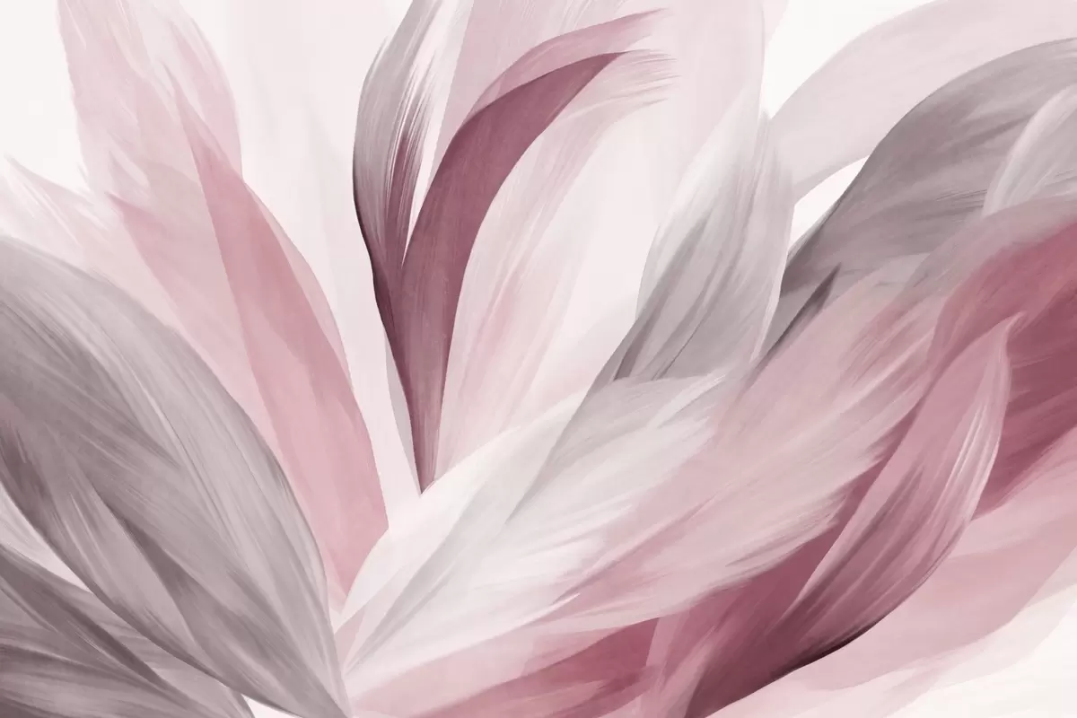 Wall Mural Photo Wallpaper Abstract textured feathers in pink, white, and gray and various shades, overlapping on a white background Nr. w09531v2