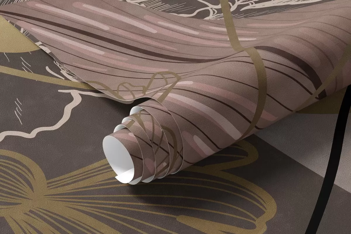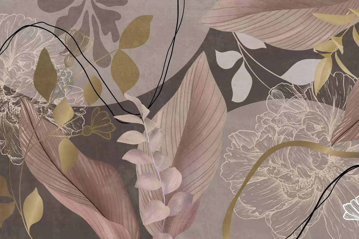 Wall Mural Photo Wallpaper Abstract floral print with large leaves in shades of muted pink and brown with thin black lines and white floral outlines Nr. w09544