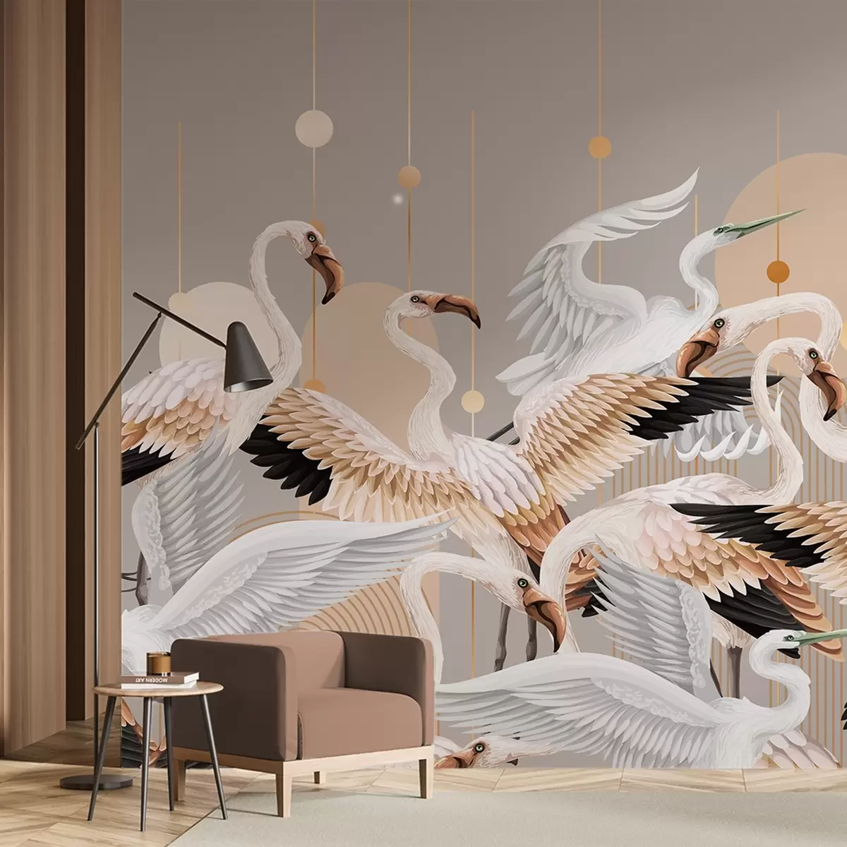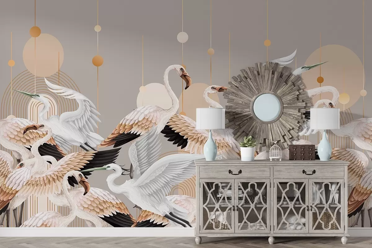 Wall Mural Photo Wallpaper A flock of white flamingos with delicate wings, against a neutral background with yellow lines and circles Nr. w09546v1