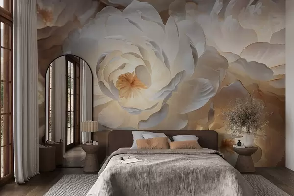 Wall Mural Photo Wallpaper Large, white fantasy peony flowers with yellow centers, soft lighting, and delicate, textured layered petals Nr. w09550