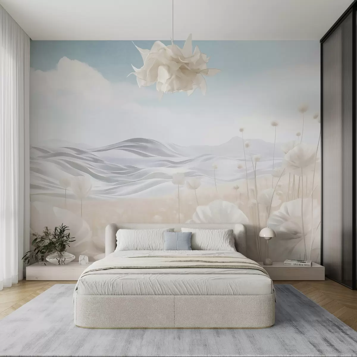 Wall Mural Photo Wallpaper Textured field of creamy poppies with rolling hills under a pale blue sky with soft clouds, pastel colors Nr. w09553