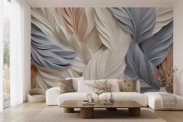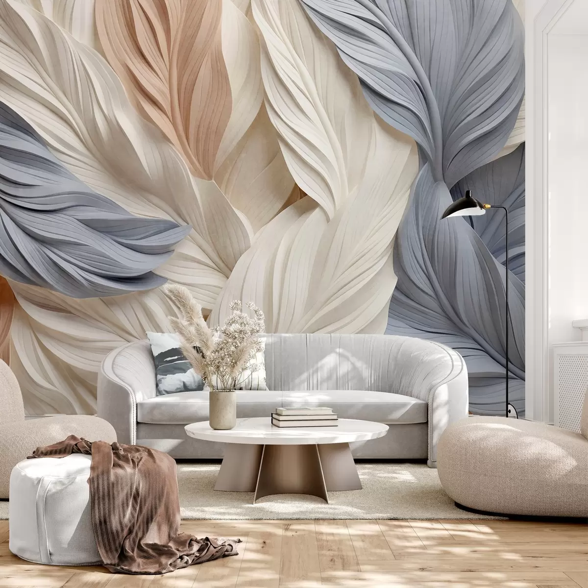 Wall Mural Photo Wallpaper Abstract, layered feathers in cream, beige, and light blue hues, with a textured, organic appearance Nr. w09603