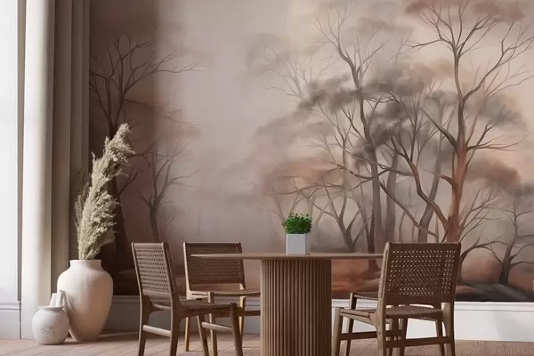 Wall Mural Photo Wallpaper Textured trees in a hazy woodland, foggy landscape with subdued muted colors and gentle lighting Nr. w09609