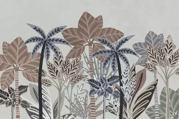 Wall Mural Photo Wallpaper Textured tropical plants and palm trees with muted colors in decorative boho style against a cream background Nr. w09639