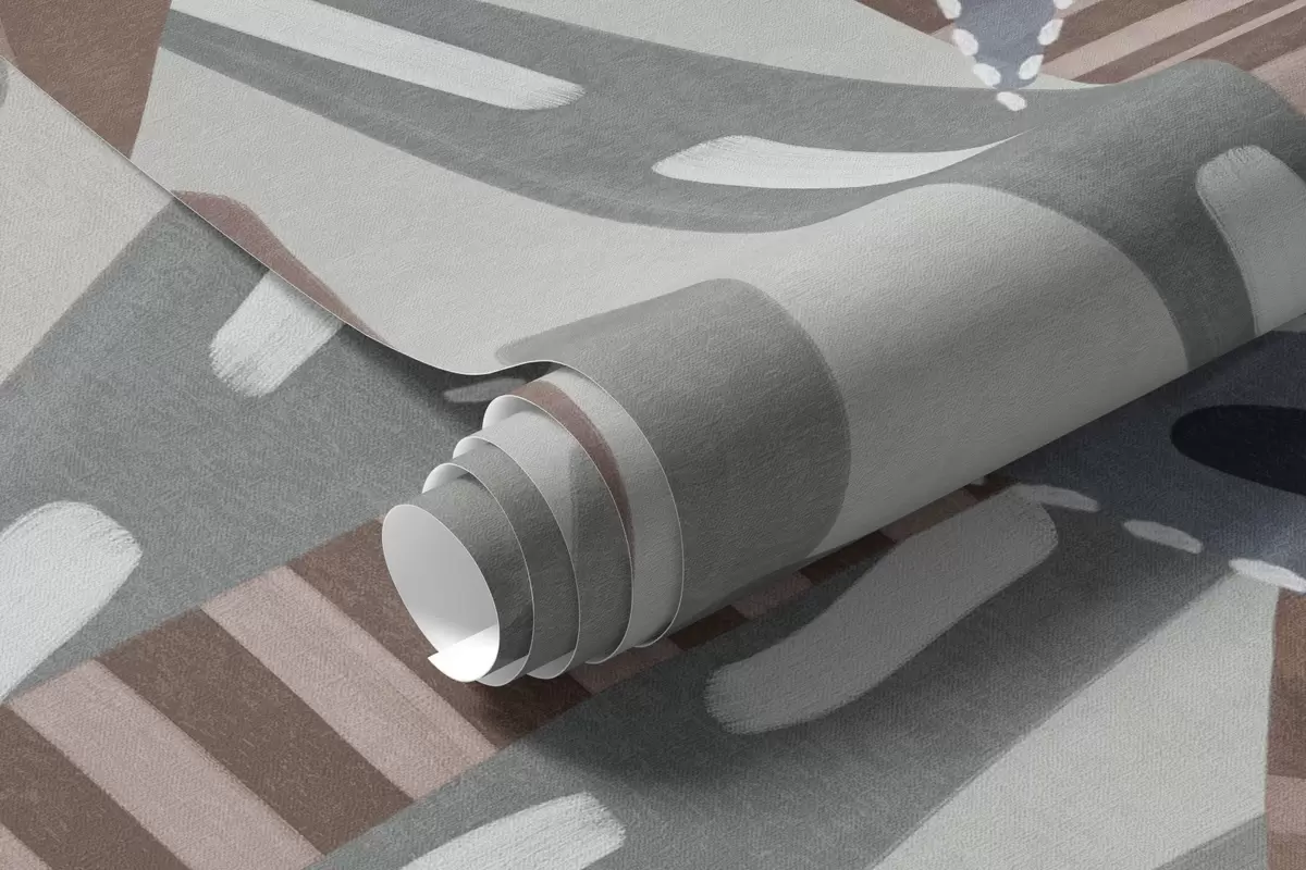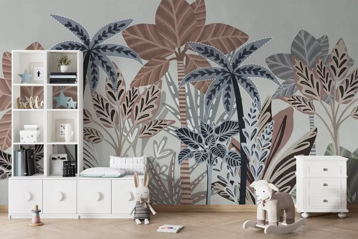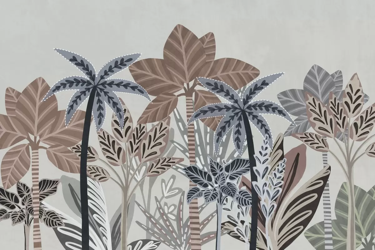 Wall Mural Photo Wallpaper Textured tropical plants and palm trees with muted colors in decorative boho style against a gray background Nr. w09639v1