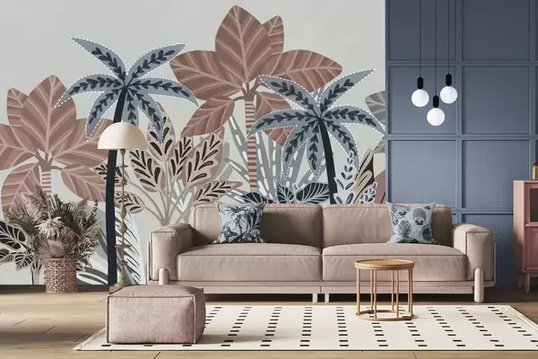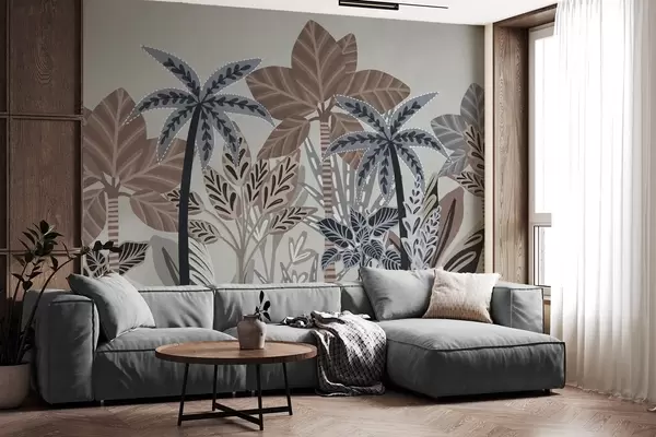 Wall Mural Photo Wallpaper Textured tropical plants and palm trees with muted colors in decorative boho style against a gray background Nr. w09639v1