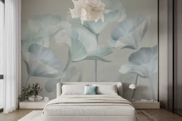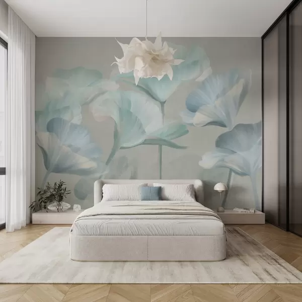 Wall Mural Photo Wallpaper Pale turquoise textured translucent lotus flowers with delicate petals against a muted gray background Nr. w09640v2