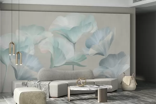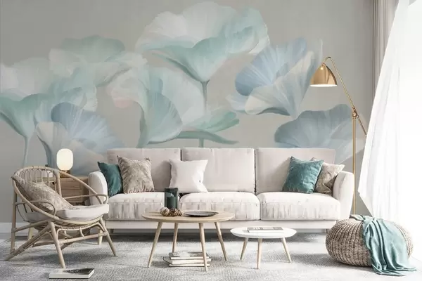 Wall Mural Photo Wallpaper Pale turquoise textured translucent lotus flowers with delicate petals against a muted gray background Nr. w09640v2