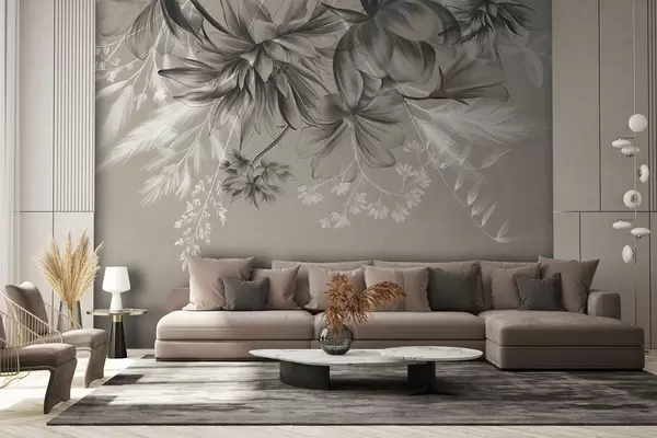 Wall Mural Photo Wallpaper Textured flowers and ferns in shades of dark gray and white against a muted beige background drawing style Nr. w09644
