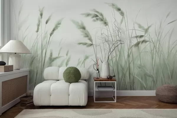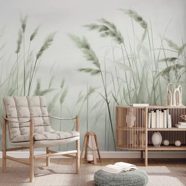Wall Mural Photo Wallpaper Tall, textured dry grass with ears of wheat in the field against a soft, pale background Nr. w09648v1