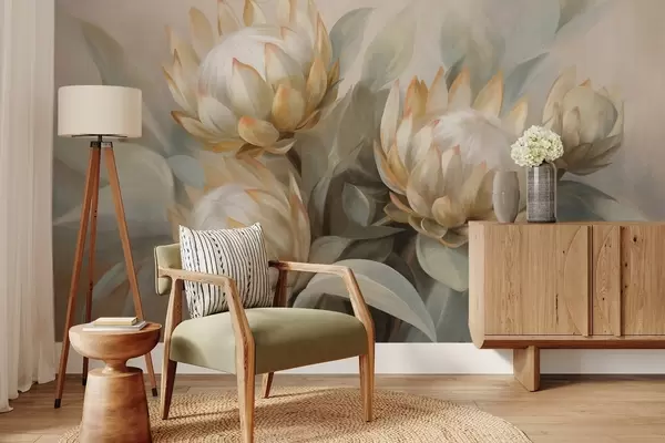 Wall Mural Photo Wallpaper Textured protea flowers with green leaves and a soft, blurred background Nr. w09738