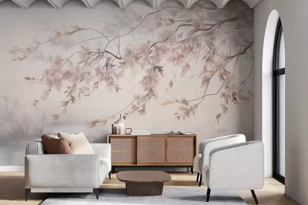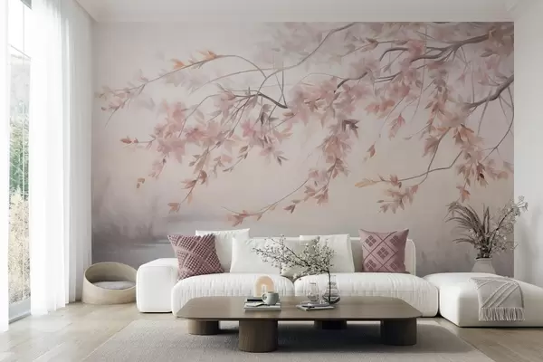 Wall Mural Photo Wallpaper Textured landscape with cherry blossom branch, pink leaves, soft, foggy background Nr. w09743
