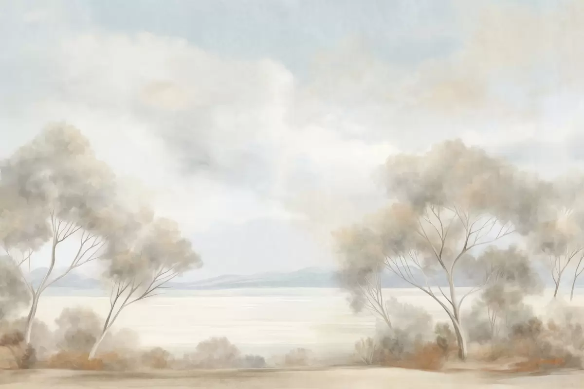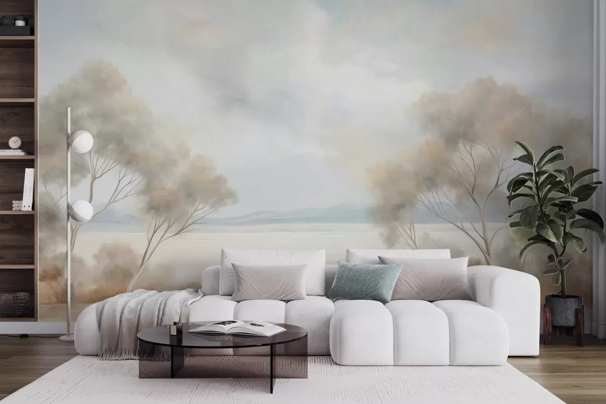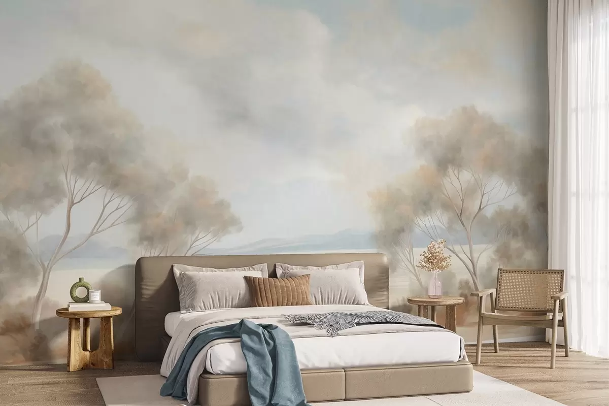 Wall Mural Photo Wallpaper A landscape textured painting style with trees under a cloudy sky Nr. w09753