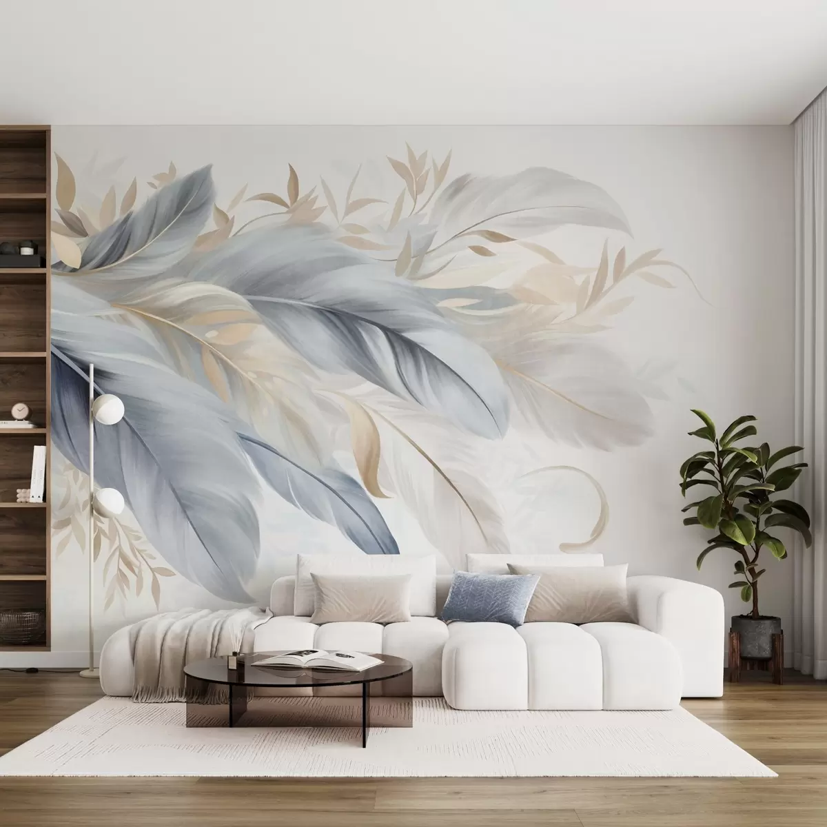 Wall Mural Photo Wallpaper Textured pastel-colored feathers and delicate leaves against a light background Nr. w09763