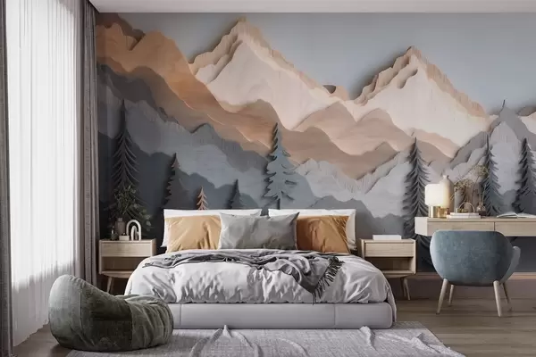 Wall Mural Photo Wallpaper Natural landscape with pine trees and mountains in carved wood style Nr. w09793