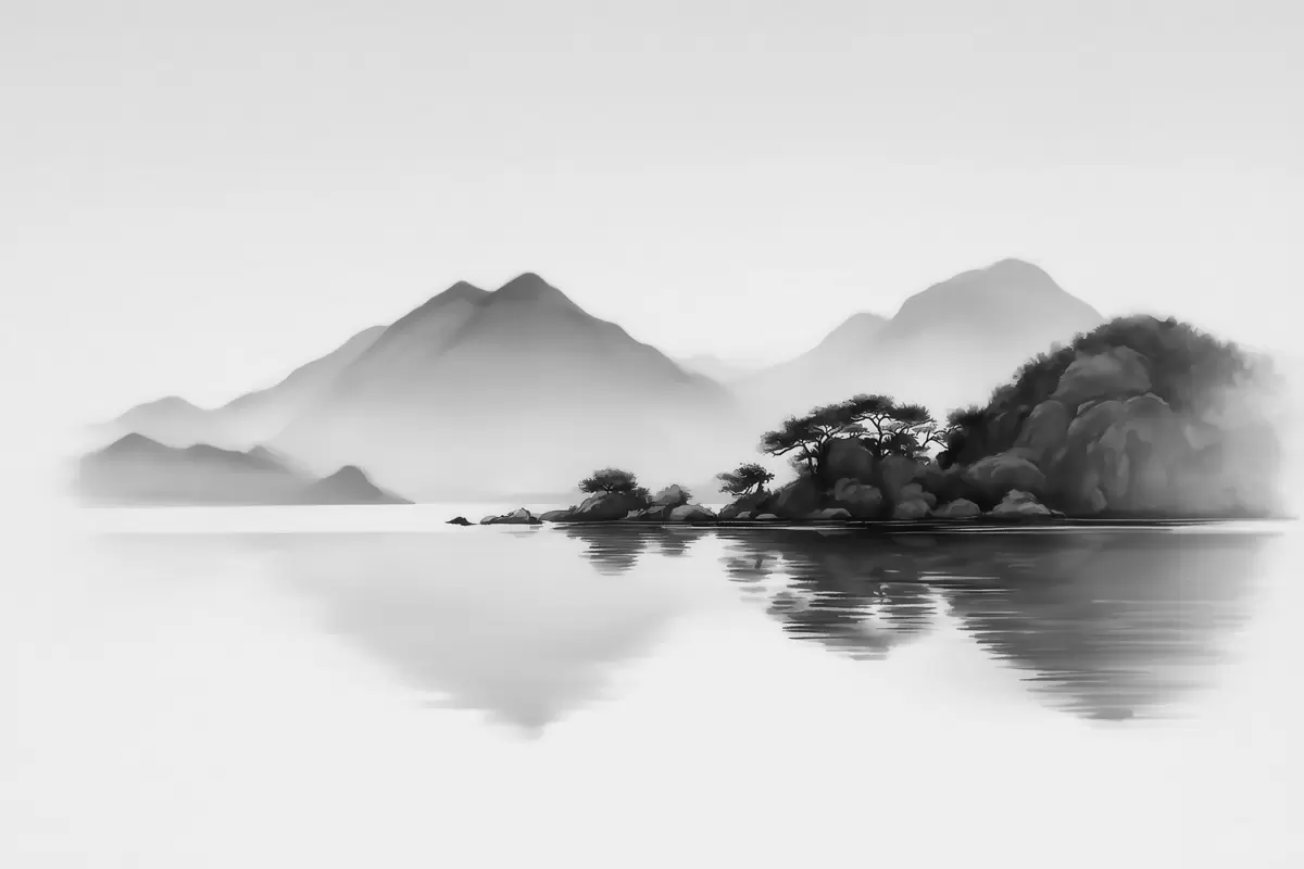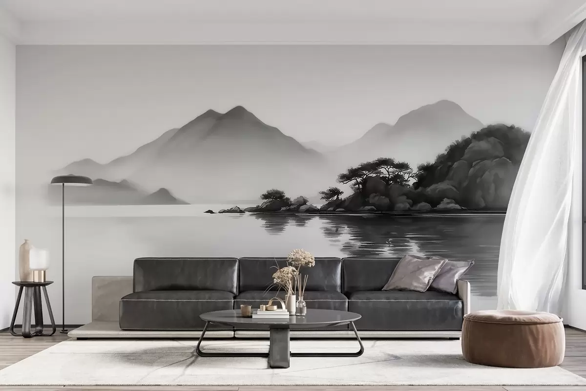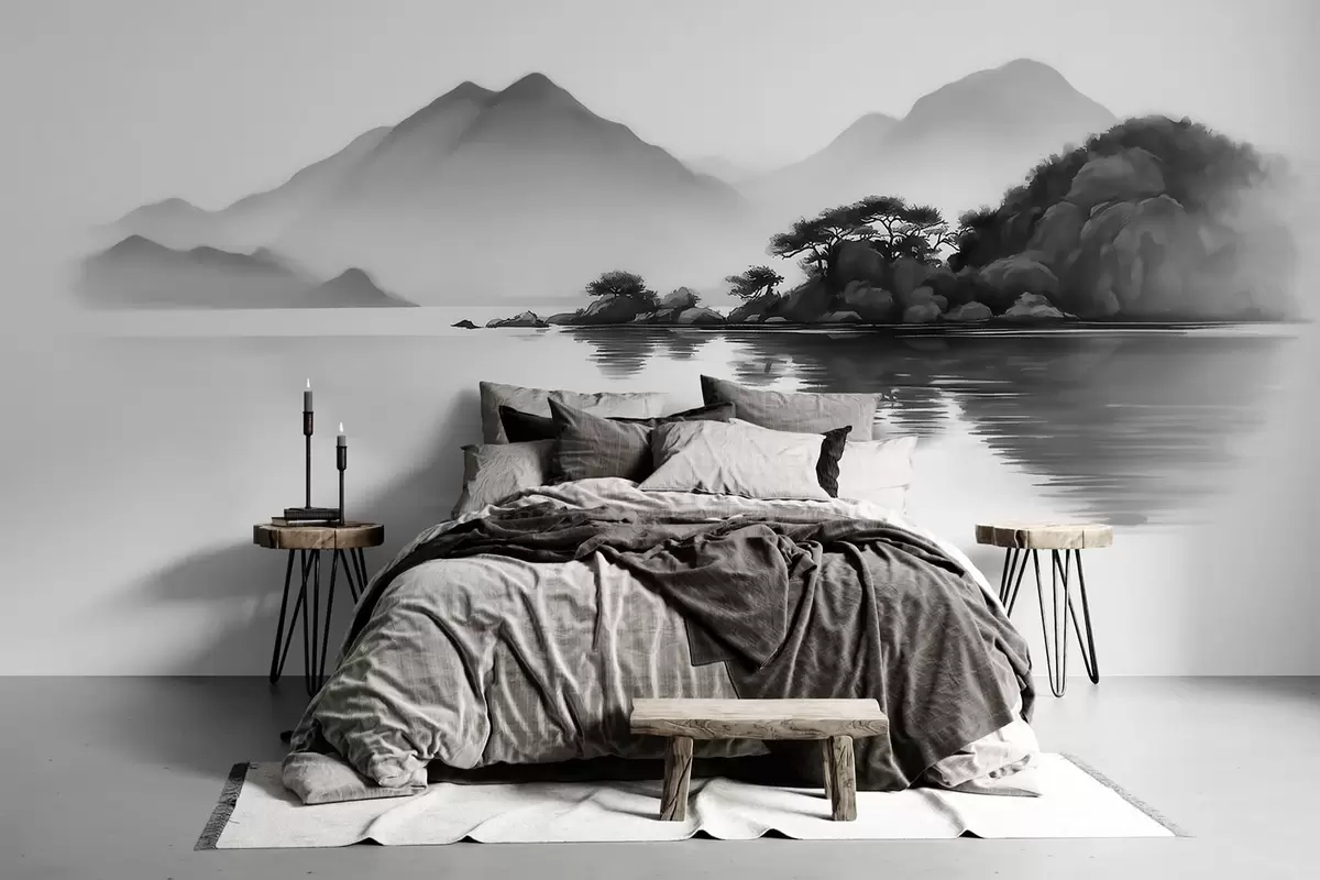 Wall Mural Photo Wallpaper Black and white landscape with mountains and lake in soft mist Nr. w09803
