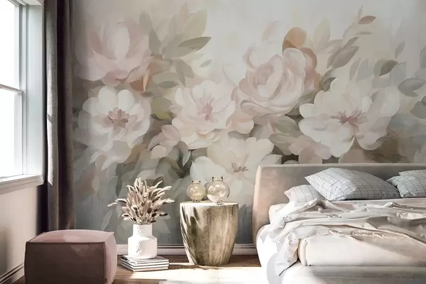 Wall Mural Photo Wallpaper Pale pink and white flowers with green leaves, painted style, impressionistic style, textured art Nr. w09824