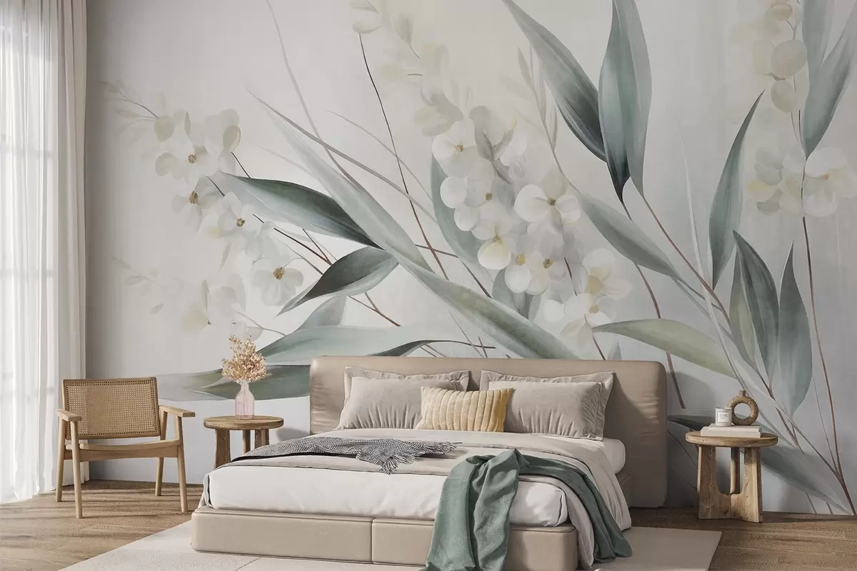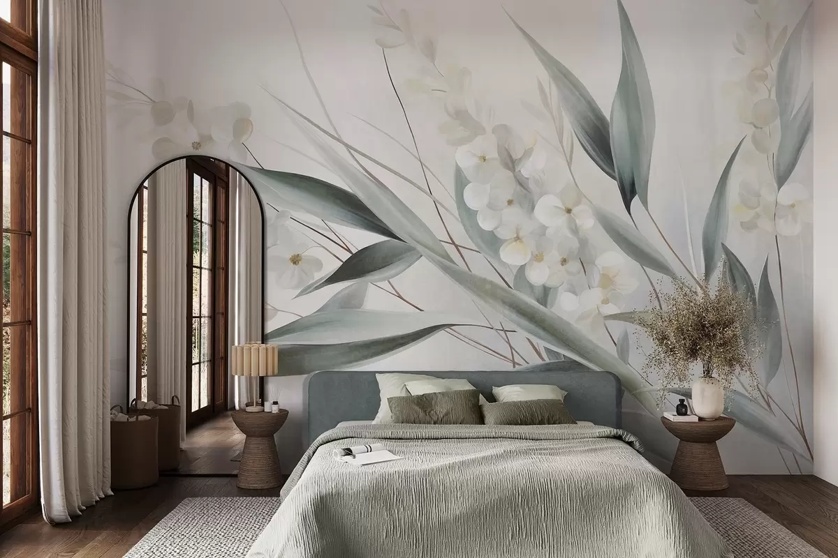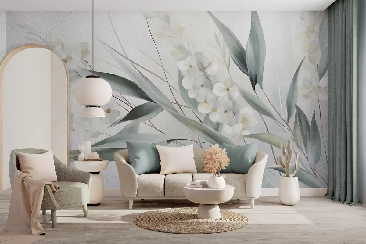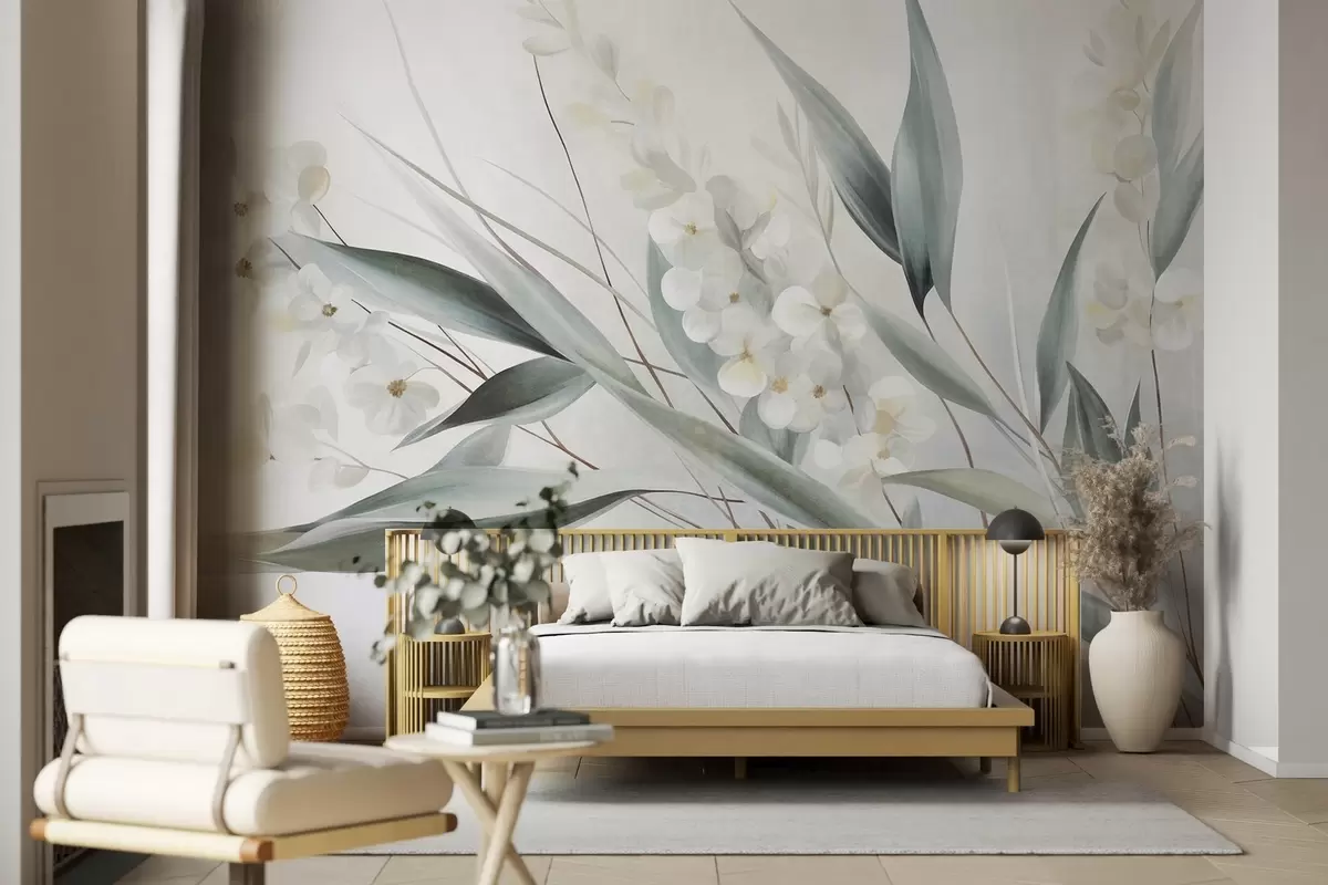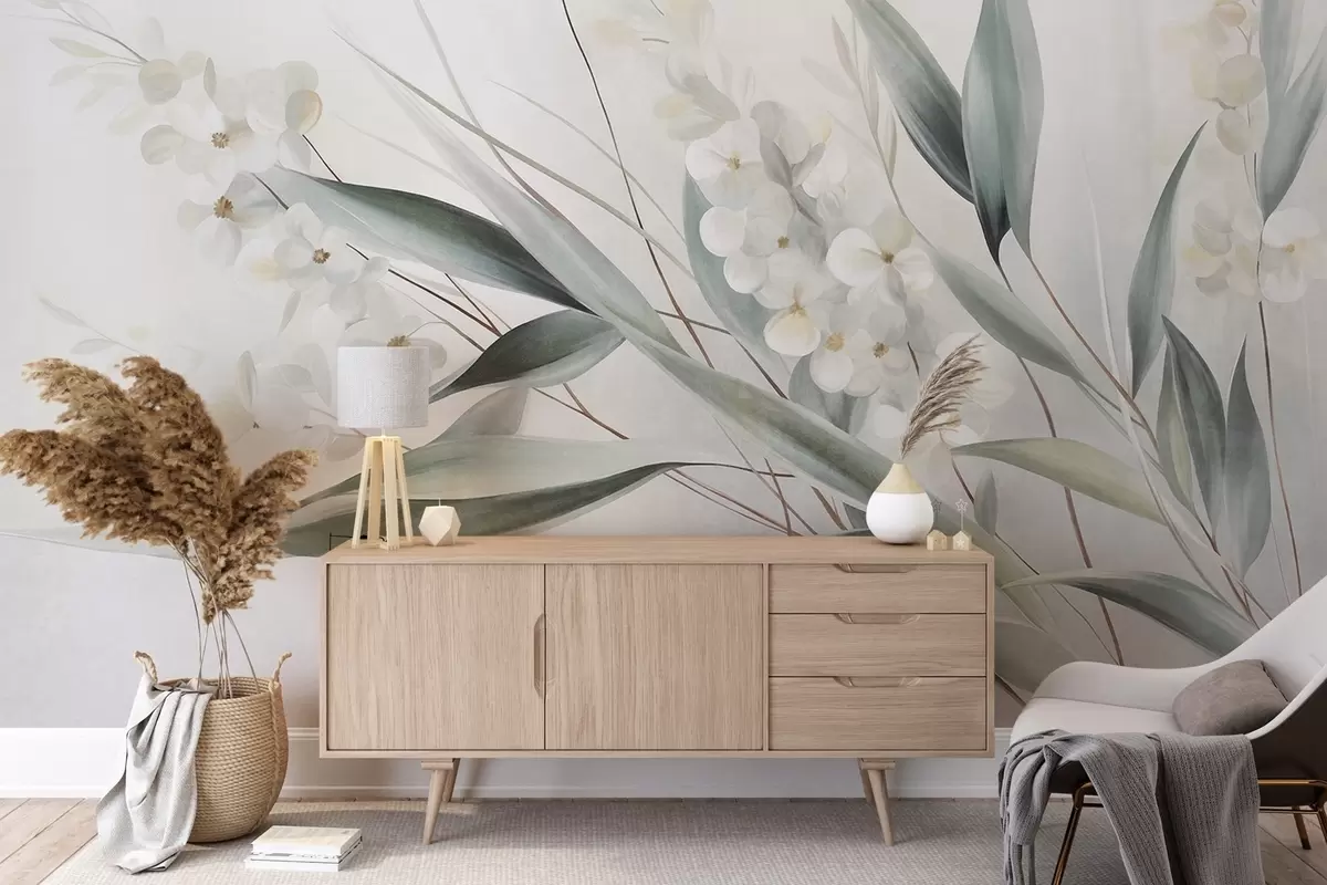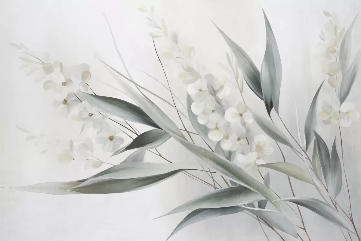 Wall Mural Photo Wallpaper Delicate flowers and long green leaves in a painterly style with subtle brushstrokes, textured art Nr. w09827