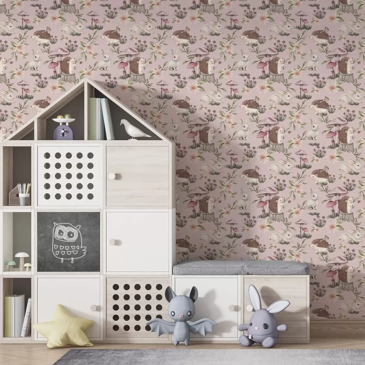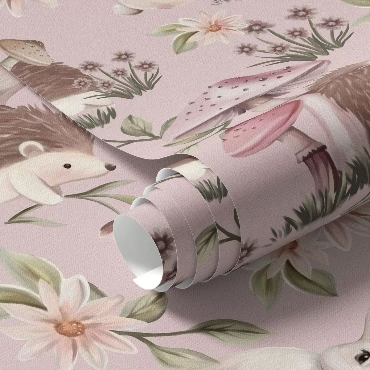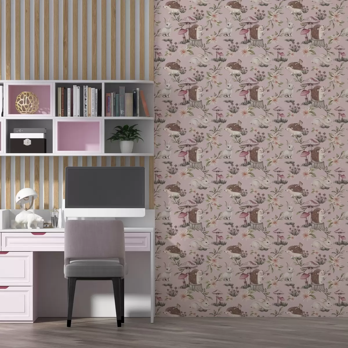 Wallpapers Fairy-tale style hedgehogs, rabbits and flowers among mushrooms on pink background Nr. a00111