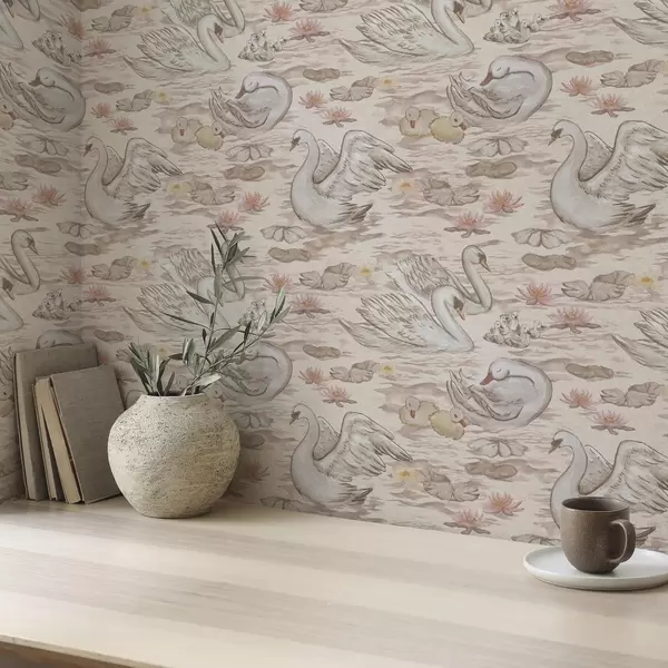 Wallpapers Swans with chicks on pink background with water lilies Nr. a00176