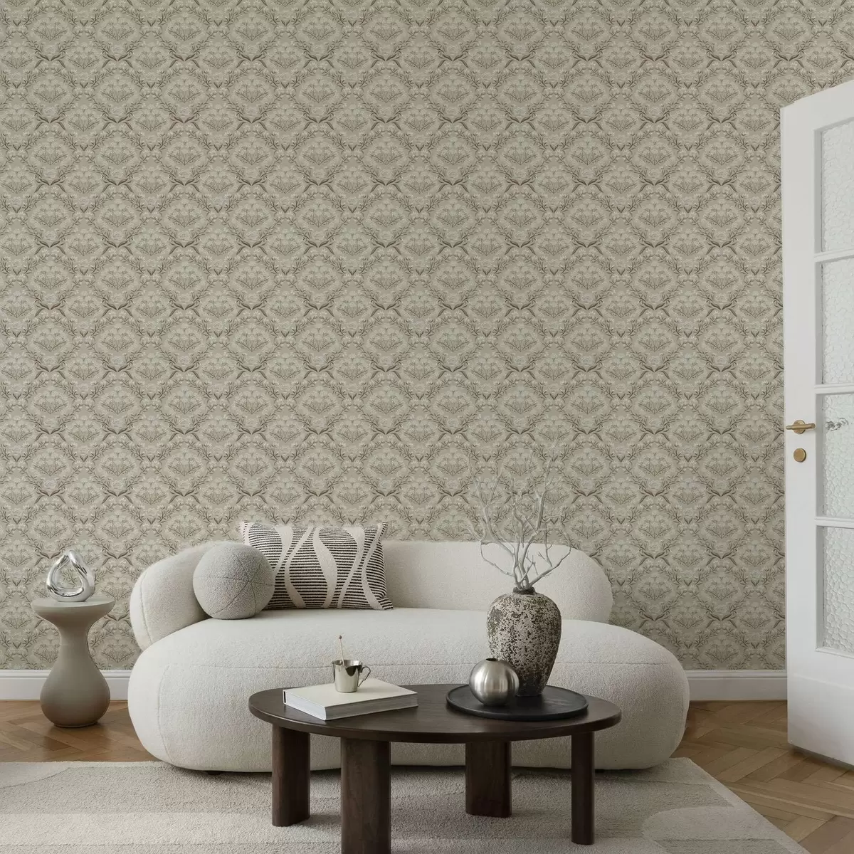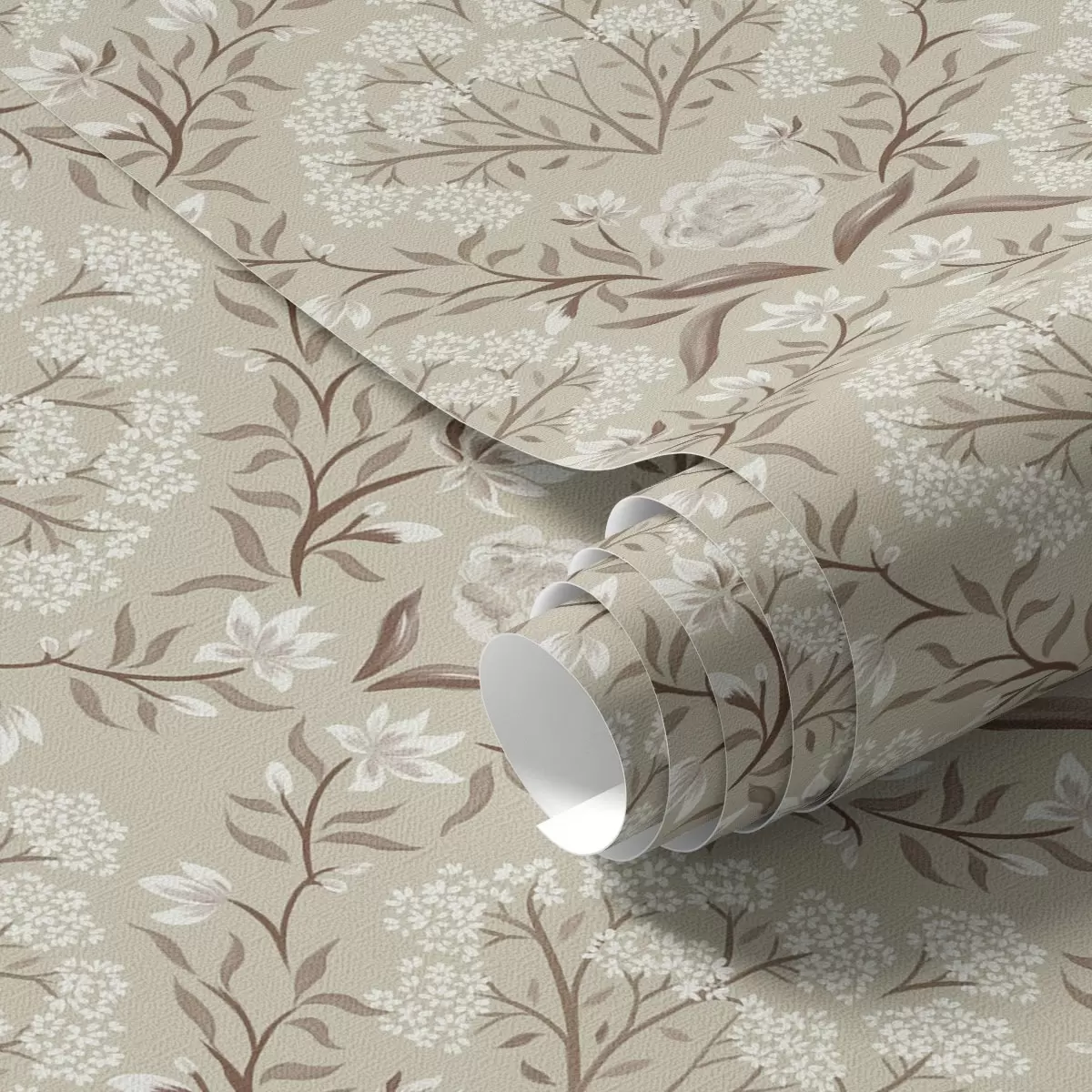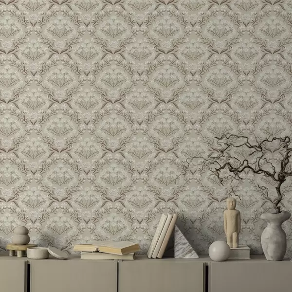 Wallpapers Beige damask: peonies, snowdrops and lacy clusters Nr. a00603v1