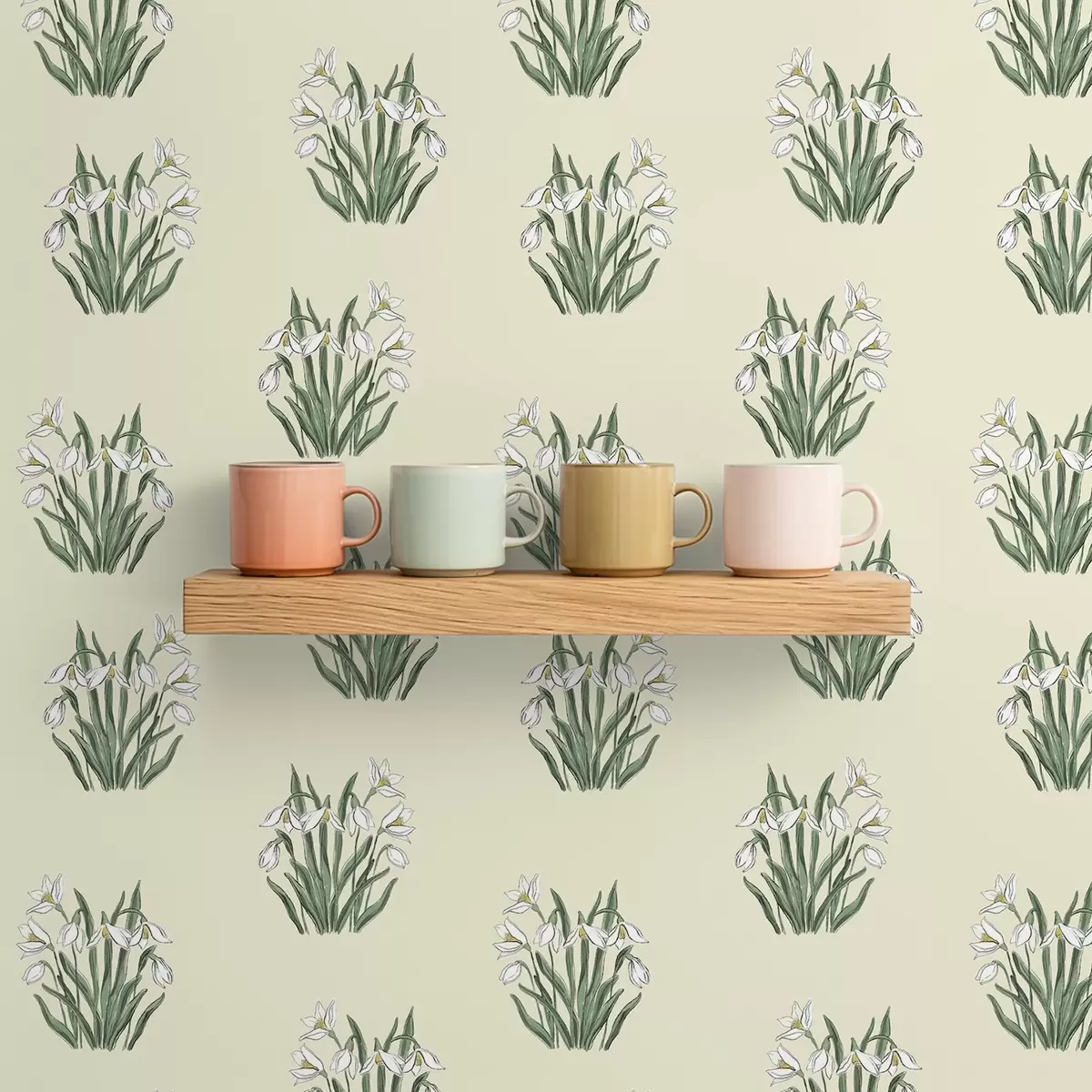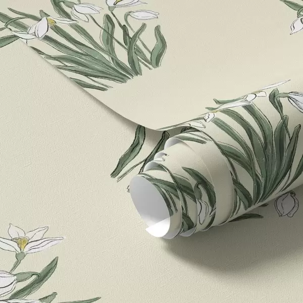 Wallpapers Snowdrops with green leaves on a creamy background Nr. a00651v2