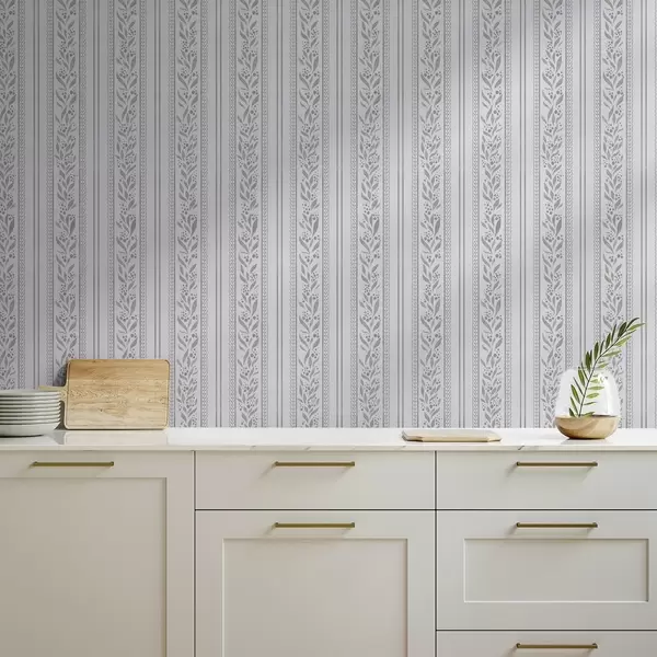 Wallpapers Stripes with lace and sprigs on cool white Nr. a00814v1