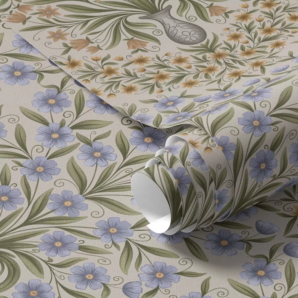 Wallpapers Folk vases with blue blossoms and olive leaves on blush Nr. a00900